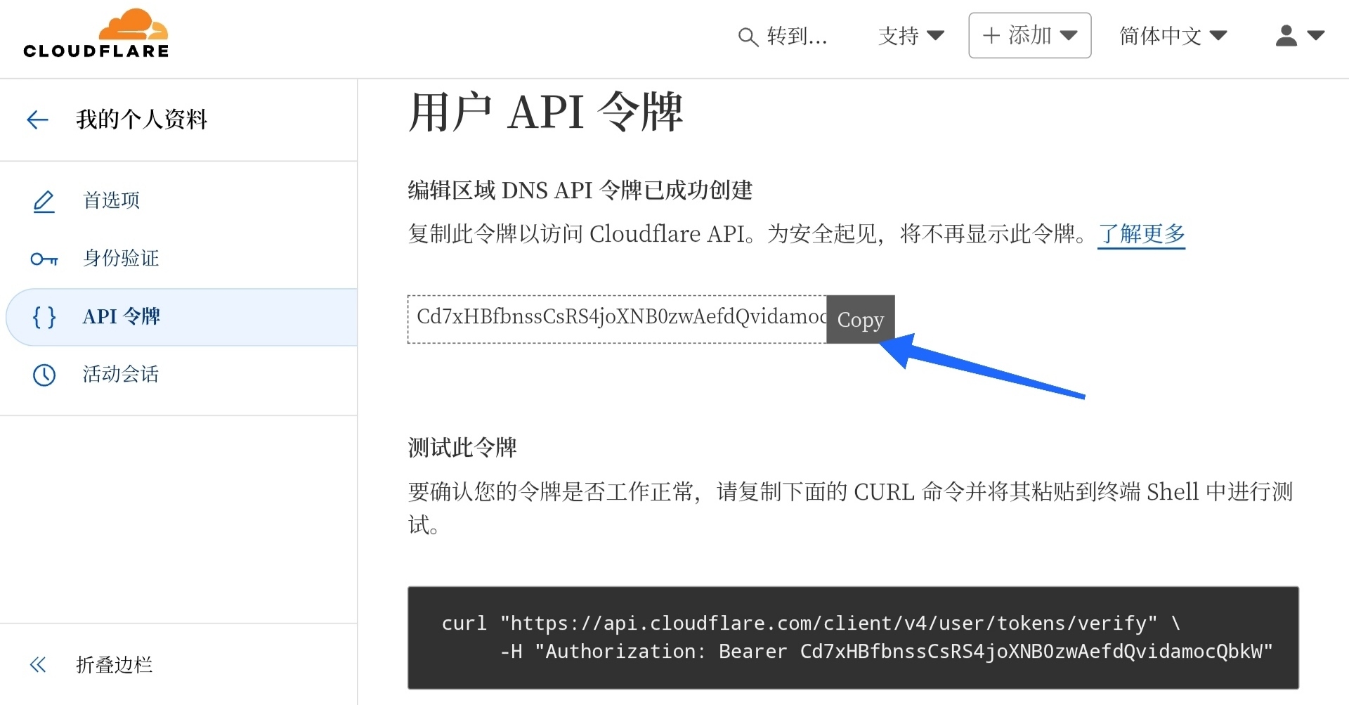 最后点击 Copy,复制你的 API 令牌,下一步要用